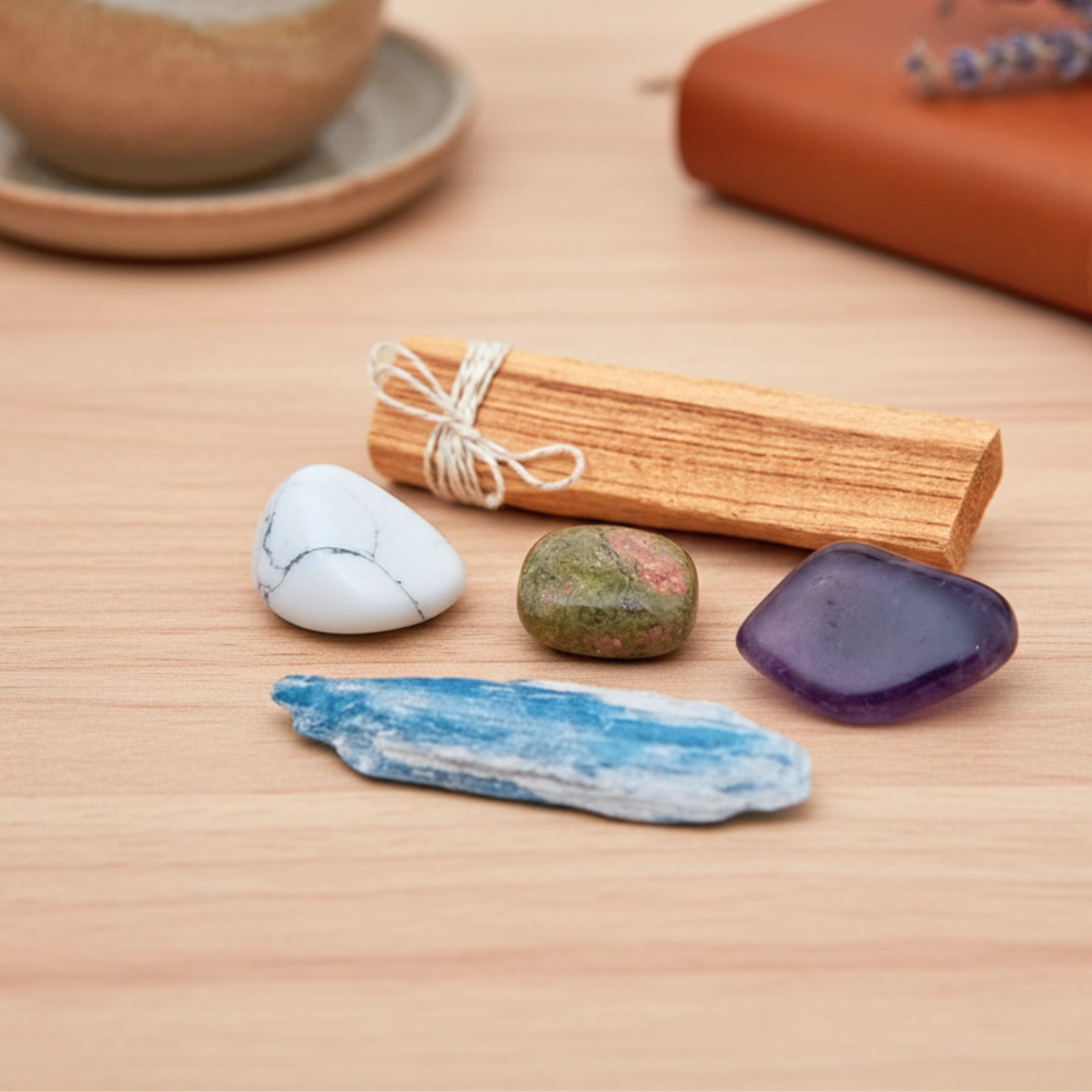 This kit is perfect for meditation practices, spiritual connection and with the Higher Self. With Amethyst, Howlite, Unakite and Blue Kyanite.