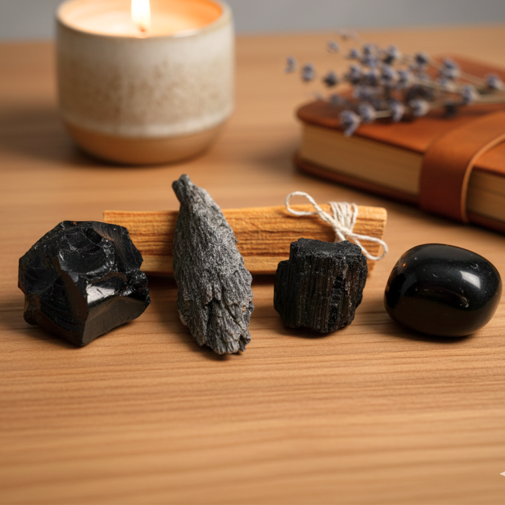 Natural Energy Shields and Transmuters. With: Onyx, Tourmaline, Black Kyanite and Obsidian.