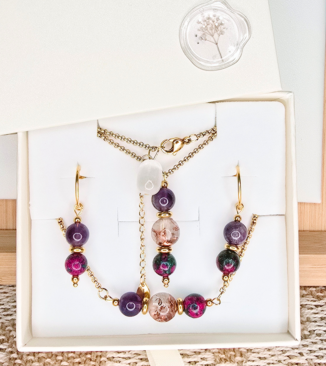 O Conjunto Aurora combina a energia natural dos cristais com a energia orgone. Personaliza-o escolhendo duas contas de cristal que ressoem com a sua energia e intenções. As contas de cristal acompanham uma elegante esfera de orgonite, feita à mão, para potenciar o equilíbrio e a harmonia.