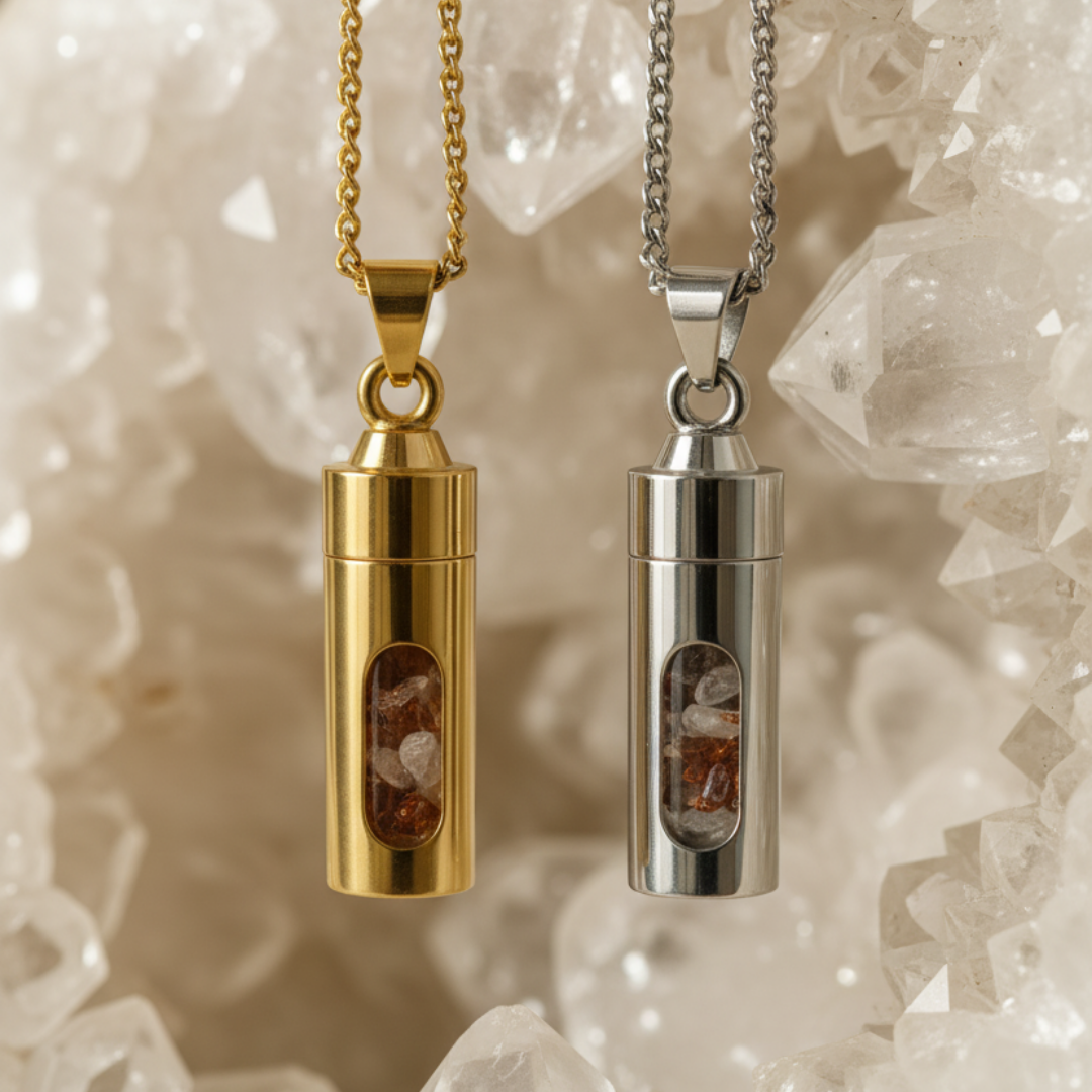 - Quartzo Hialino: O amplificador mestre. Ele potencia a ação de todos os cristais, garantindo que o teu pingente trabalha no seu máximo potencial.